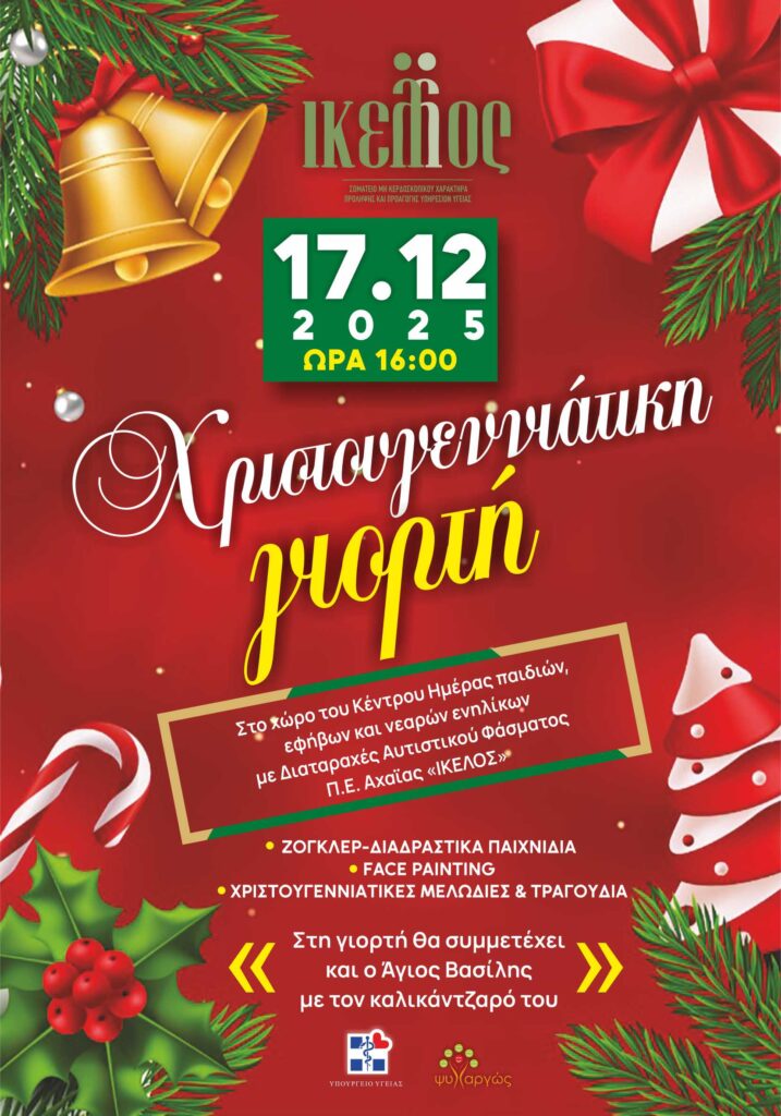 Το Σωματείο «ΙΚΕΛΟΣ» σας προσκαλεί σε μια ζεστή και χαρούμενη Χριστουγεννιάτικη γιορτή, την Τρίτη 17 Δεκεμβρίου 2025, στις 16:00, στον χώρο του Κέντρου Ημέρας παιδιών, εφήβων και νεαρών ενηλίκων με Διαταραχές Αυτιστικού Φάσματος στην Π.Ε. Αχαΐας.
